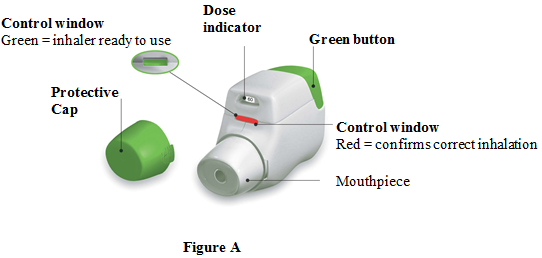 The inhaler device is a multicomponent device made of polycarbonate, acrylonitrile-butadiene-styrene, polyoxymethylene, polyester-butylene-terephthalate, polypropylene, polystyrene and stainless steel. It is white-coloured with an integral dose indicator and a green dosage button. The mouthpiece is covered with a removable green protective cap. The inhaler is supplied in a plastic laminate pouch, placed in a cardboard carton.