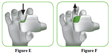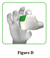 1.3 Hold the inhaler horizontally with the mouthpiece facing you and the green button on top (Figure D).