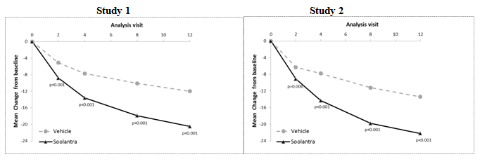 Soolantra was statistically superior to vehicle cream on the co-primary efficacy endpoints with a time to onset of efficacy of 4 weeks of treatment (p<0.05).