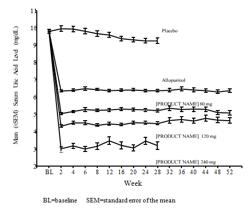 The ability of febuxostat to lower serum uric acid levels was prompt and persistent. Reduction in serum uric acid level to <6.0 mg/dL (357 µmol/L) was noted by the Week 2 visit and was maintained throughout treatment. The mean serum uric acid levels over time for each treatment group from the two pivotal Phase 3 studies are shown in Figure 1.