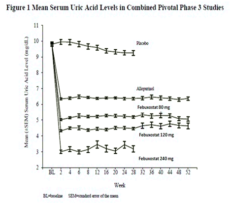 The ability of febuxostat to lower serum uric acid levels was prompt and persistent. Reduction in serum uric acid level to <6.0 mg/dL (357 µmol/L) was noted by the Week 2 visit and was maintained throughout treatment. The mean serum uric acid levels over time for each treatment group from the two pivotal Phase 3 studies are shown in Figure 1.