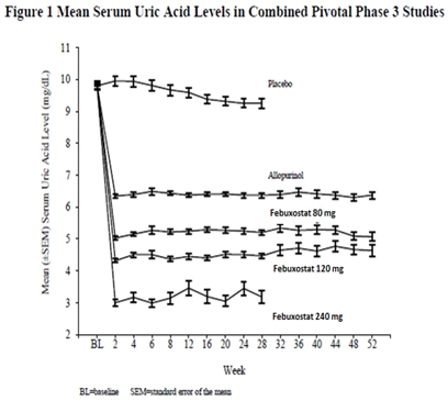 The ability of febuxostat to lower serum uric acid levels was prompt and persistent. Reduction in serum uric acid level to <6.0 mg/dL (357 µmol/L) was noted by the Week 2 visit and was maintained throughout treatment. The mean serum uric acid levels over time for each treatment group from the two pivotal Phase 3 studies are shown in Figure 1.
