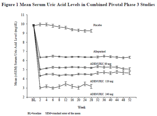 The ability of febuxostat to lower serum uric acid levels was prompt and persistent. Reduction in serum uric acid level to <6.0 mg/dL (357 µmol/L) was noted by the Week 2 visit and was maintained throughout treatment. The mean serum uric acid levels over time for each treatment group from the two pivotal Phase 3 studies are shown in Figure 1.
