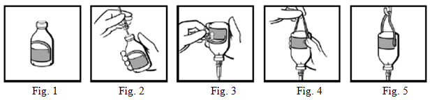 The vials are supplied with a hanger label (Fig. 1). After inserting the infusion set (Fig. 2), invert the vial and fold back the loop section of the label (Fig. 3). Use firm finger pressure to create a crease on each side where the loop section joins the rest of the label (Fig. 4). Suspend the vial from the infusion stand by the resulting loop (Fig. 5).