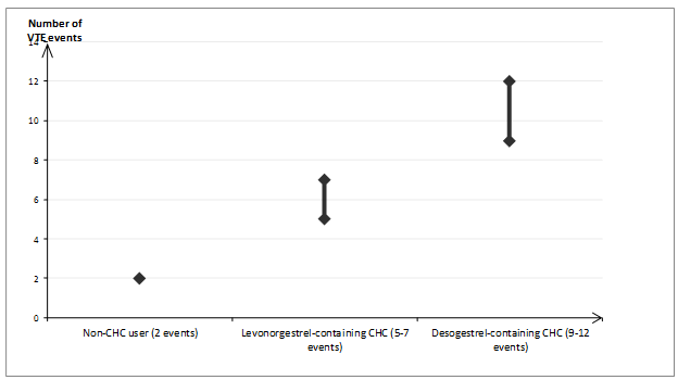 It is estimated1 that out of 10,000 women who use a CHC containing desogestrel between 9 and 12 women will develop a VTE in one year; this compares with about 62 in women who use a levonorgestrel-containing CHC.