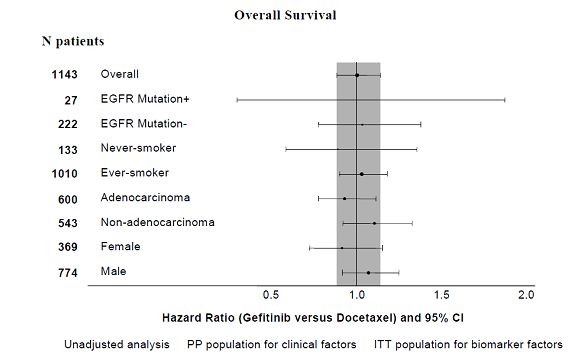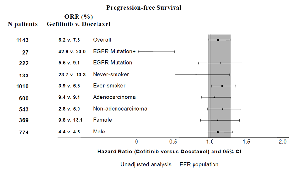 The IFUM study was a single-arm, multicentre study conducted in Caucasian patients (n=106) with activating, sensitizing EGFR mutation positive NSCLC to confirm that the activity of gefitinib is similar in Caucasian and Asian populations. The ORR according to investigator review was 70% and the median PFS was 9.7 months. These data are similar to those reported in the IPASS study.