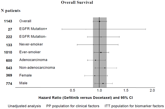 Hazard ratio (hazard ratios <1 favour gefitinib).