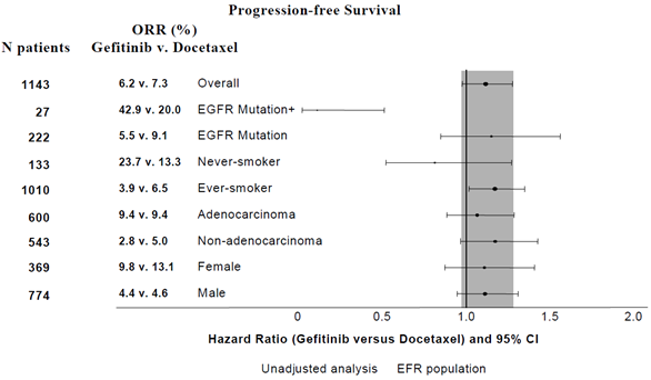 The IFUM study was a single-arm, multicentre study conducted in Caucasian patients (n=106) with activating, sensitizing EGFR mutation positive NSCLC to confirm that the activity of gefitinib is similar in Caucasian and Asian populations. The ORR according to investigator review was 70% and the median PFS was 9.7 months. These data are similar to those reported in the IPASS study.