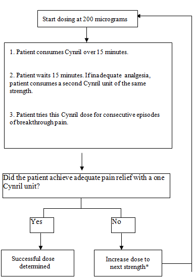 The initial dose of Cynril used should be 200 micrograms, titrating upwards as necessary through the range of available dosage strengths (200, 400, 600, 800, 1200 and 1600 micrograms). Patients should be carefully monitored until a dose is reached that provides adequate analgesia with acceptable adverse reaction using a single dosage unit per episode of breakthrough pain. This is defined as the successful dose.