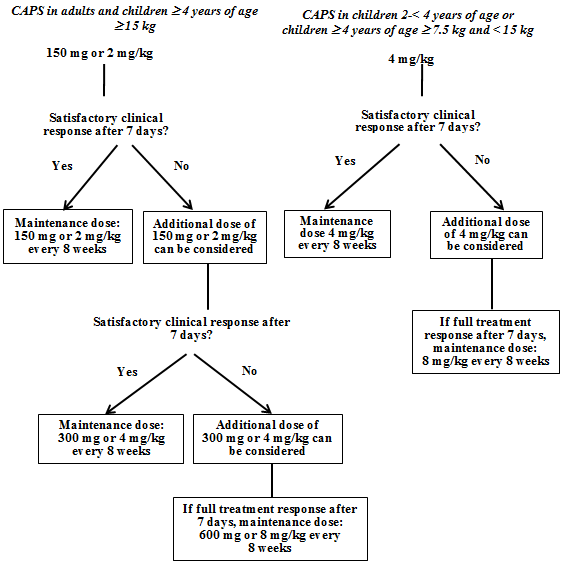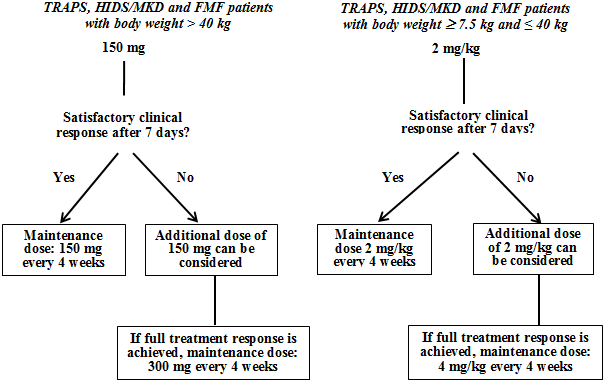 For patients with a starting dose of 150 mg or 2 mg/kg, if a satisfactory clinical response (resolution of rash and other generalised inflammatory symptoms) has not been achieved 7 days after treatment start, a second dose of canakinumab at 150 mg or 2 mg/kg can be considered. If a full treatment response is subsequently achieved, the intensified dosing regimen of 300 mg or 4 mg/kg every 8 weeks should be maintained. If a satisfactory clinical response has not been achieved 7 days after this increased dose, a third dose of canakinumab at 300 mg or 4 mg/kg can be considered. If a full treatment response is subsequently achieved, maintaining the intensified dosing regimen of 600 mg or 8 mg/kg every 8 weeks should be considered, based on individual clinical judgement.