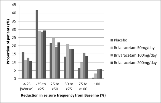 In a pooled analysis of the three pivotal trials, no differences in efficacy (measured as 50 % responder rate) was observed within the dose range of 50 mg/day to 200 mg/day when brivaracetam is combined with inducing or non-inducing AEDs. In clinical studies 2.5 % (4/161), 5.1 % (17/332) and 4.0% (10/249) of the patients on brivaracetam 50 mg/day, 100 mg/day and 200 mg/day respectively became seizure free during the 12-week treatment period compared with 0.5 % (2/418) on placebo.