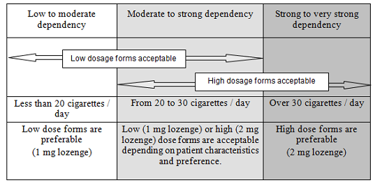 The initial dosage should be individualised on the basis of the patient's nicotine dependence. One piece of lozenge to suck when the user feels the urge to smoke.