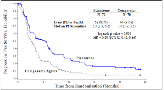 Patients treated with Pixuvri demonstrated 40% improvement in progression free survival compared to patients treated with comparator agents with 2.7 months longer median PFS (hazard ratio (HR)=0.60, log rank p=0.005) (see Figure 1 below).
