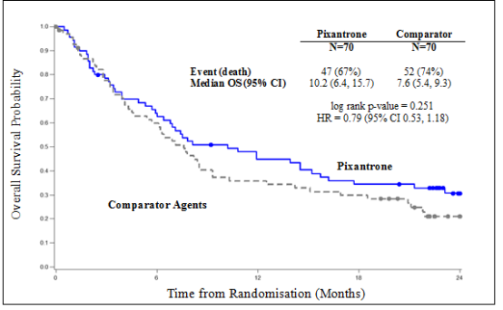 The median overall survival for patients treated with Pixuvri was 2.6 months longer compared to patients treated with comparator (HR=0.79, log rank p=0.25) (see Figure 2 below).