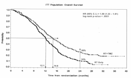 The hazard ratio (HR) for overall survival was 1.59 (95 % CI for HR=1.33-1.91) with a log-rank p < 0.0001 in favour of the TMZ arm. The estimated probability of surviving 2 years or more (26 % vs 10 %) is higher for the RT + TMZ arm. The addition of concomitant TMZ to RT, followed by TMZ monotherapy in the treatment of patients with newly-diagnosed glioblastoma multiforme demonstrated a statistically significant improvement in overall survival (OS) compared with RT alone (Figure 1).
