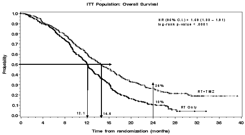 The hazard ratio (HR) for overall survival was 1.59 (95% CI for HR=1.33 -1.91) with a log-rank p < 0.0001 in favour of the TMZ arm. The estimated probability of surviving 2 years or more (26% vs 10%) is higher for the RT + TMZ arm. The addition of concomitant TMZ to RT, followed by TMZ monotherapy in the treatment of patients with newly diagnosed glioblastoma multiforme demonstrated a statistically significant improvement in overall survival (OS) compared with RT alone (Figure 1).