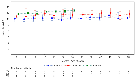 **Transfusion independence (TI): a weighted average Hb ≥9 g/dL without any RBC transfusions for a continuous period of ≥12 months at any time during the study after medicinal product infusion.
