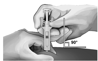 - Hold the safety syringe as shown and smoothly insert the needle at an angle of approximately 90° (see Figure 5). Push the needle all the way in.