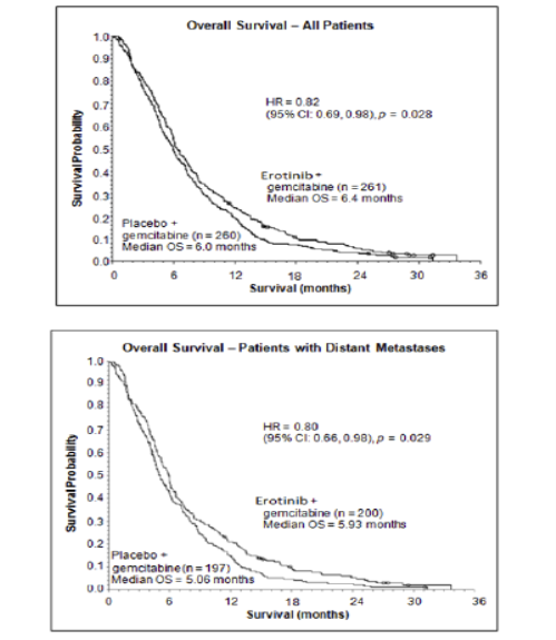 A second population pharmacokinetic analysis was conducted that incorporated erlotinib data from 204 pancreatic cancer patients who received erlotinib plus gemcitabine. This analysis demonstrated that co-variants affecting erlotinib clearance in patients from the pancreatic study were very similar to those seen in the prior single agent pharmacokinetic analysis. No new covariate effects were identified. Co-administration of gemcitabine had no effect on erlotinib plasma clearance.