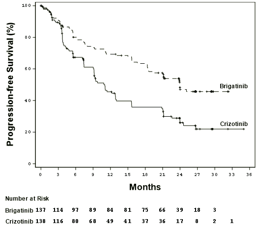 In a separate dose finding study, 25 patients with ALK-positive NSCLC that progressed on crizotinib were administered Alunbrig at 180 mg once daily with 7-day lead-in at 90 mg once daily regimen. Of these, 19 patients had an investigator-assessed confirmed objective response (76%; 95% CI: 55, 91) and the KM estimate median duration of response among the 19 responders was 26.1 months (95% CI: 7.9, 26.1). The KM median PFS was 16.3 months (95% CI: 9.2, NE) and the 12-month probability of overall survival was 84.0% (95% CI: 62.8, 93.7).
