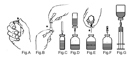 1. Remove protective covering from one end of the enclosed filter needle by twisting and fit the needle onto a sterile disposable syringe. Draw the solution into the syringe (Fig. G).