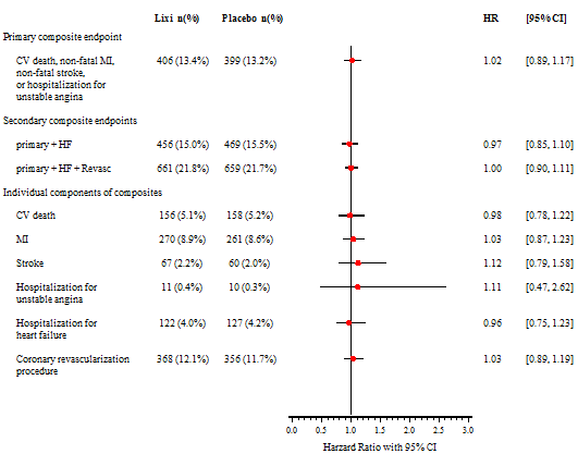Ninety-six percent of the patients in both treatment groups completed the study in accordance with the protocol and the vital status was known at the end of the study for 99.0% and 98.6% of the patients in the lixisenatide and placebo group, respectively. Median treatment duration was 22.4 months in the lixisenatide group and 23.3 months in the placebo group, and the median duration of study follow-up was 25.8 and 25.7 months, respectively. Mean HbA1c (±SD) in the lixisenatide and placebo groups was 7.72 (±1.32)% and 7.64 (±1.28)% at baseline and 7.46 (±1.51)% and 7.61 (±1.48)% at 24 months, respectively.