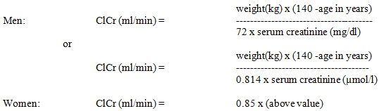 When creatinine clearance cannot be measured, it can be estimated with reference to the serum creatinine level using the following Cockcroft's formula for adults: