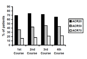 The need for further courses should be evaluated 24 weeks following the previous course. Retreatment should be given at that time if residual disease activity remains, otherwise retreatment should be delayed until disease activity returns.