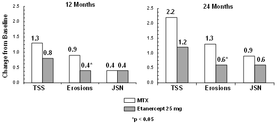 In part 1 of the study, 51 of 69 (74%) patients demonstrated a clinical response and entered part 2. In part 2, 6 of 25 (24%) patients remaining on etanercept experienced a disease flare compared to 20 of 26 (77%) patients receiving placebo (p = 0.007). From the start of part 2, the median time to flare was 116 days for patients who received etanercept and 28 days for patients who received placebo. Of patients who demonstrated a clinical response at 90 days and entered part 2 of the study, some of the patients remaining on etanercept continued to improve from month 3 through month 7, while those who received placebo did not improve.