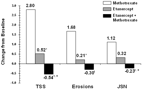After the 12-week double-blind treatment period, all patients received etanercept 0.8 mg/kg (up to 50 mg) once weekly for additional 24 weeks. Responses observed during the open-label period were similar to those observed in the double-blind period.