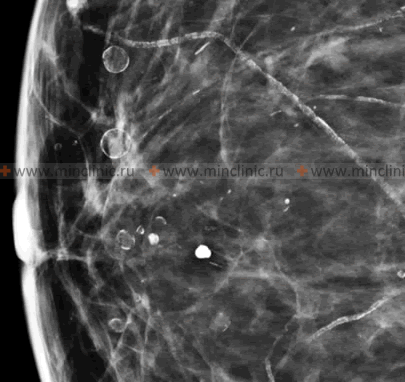 - Microcalcifications: These are tiny specks of calcium, often smaller than 0.5 mm. While most microcalcifications are also benign, certain patterns of microcalcifications found during mammography can be suspicious. For example, clusters of pleomorphic (varying in shape and size), linear, or branching microcalcifications may indicate excessive activity of breast tissue cells (e.g., ductal carcinoma in situ - DCIS, an early non-invasive form of breast cancer) and are often considered by a mammologist as an early manifestation of a potentially cancerous process in a woman. Such findings typically warrant further evaluation, such as magnification views on mammography, ultrasound, or biopsy (e.g., stereotactic core biopsy).