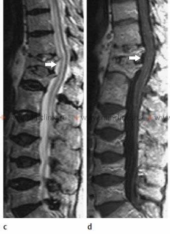 ხერხემლის მაგნიტურ-რეზონანსულ ტომოგრაფიაზე ჩანს კომპრესიული მოტეხილობის შედეგად მიღებული ზურგის ტვინის მწვავე იშემია მალების სხეულების გადაადგილების თანხლებით გამოხატული ოსტეოპოროზის დროს.