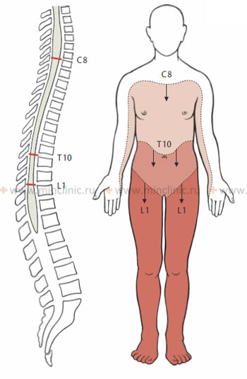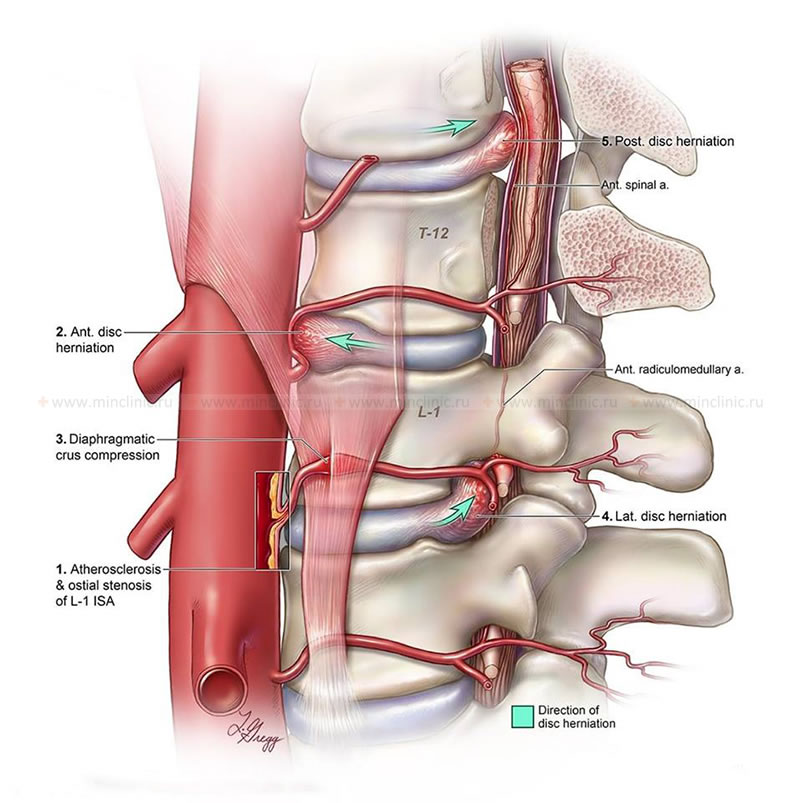 ზურგის ტვინის იშემიის და ინსულტის მიზეზები: სეგმენტური არტერიის სტენოზი ან შეკუმშვა მალთაშუა დისკოს თიაქარით, დიაფრაგმის ფეხის სინდრომი.