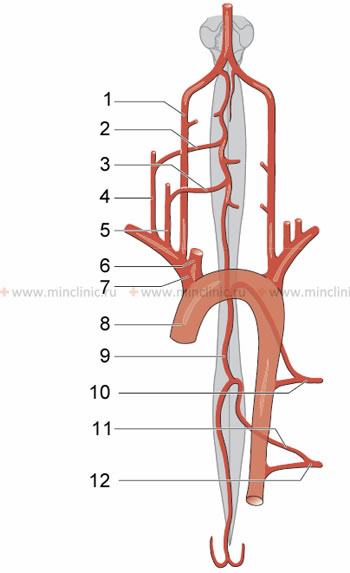 1 - ხერხემლის არტერია, 2 - წინა ფესვური არტერია C4-C5, 3 - წინა ფესვური არტერია C6-C8, 4 - ნეკნ -კისრის ღერო, 5 - ფარ-კისრის ღერო, 6 - საერთო საძილე არტერია, 7 - მხარ-თავის ღერო, 8 - აორტა, 9 - ხერხემლის წინა არტერია, 10 - უკანა ნეკნთაშუა არტერია Th4-Th6, 11 - დიდი ფესვური არტერია (ადამკევიჩის არტერია), 12 - უკანა ნეკნთაშუა არტერია Th9-L1.