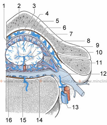 1 – ქსელისებრი გარსი, 2 - ტვინის მაგარი გარსი, 3 - ხერხემლის უკანა გარე ვენოზური წნული, 4 - ზურგის ტვინის უკანა ვენა, 5 - უკანა ცენტრალური ვენა, 6 - ზურგის ტვინის უკანა -გვერდითი ვენები, 7 - სულკოკომისურალური ვენა, 8 - ღარის ვენა, 9 - ძვლისზარდელა, 10 - წინა და უკანა ფესვური ვენები, 11 - ზურგის ტვინის წინა შიდა ვენოზური წნულები, 12 - მალთაშუა ვენა, 13 - მალების ვენები, 14 - ზურგის ტვინის წინა გარე ვენოზური წნული, 15 - ბაზალურ-ვერტებრალური ვენა, 16 - ზურგის ტვინის წინა ვენა.