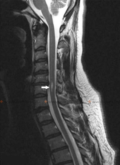 ზურგის ტვინის კისრის მაგნიტურ-რეზონანსულ ტომოგრაფიაზე ვლინდება სირინგომიელიის სივრცე C6 მალის სხეულის დონეზე (ნაჩვენებია ისრით).