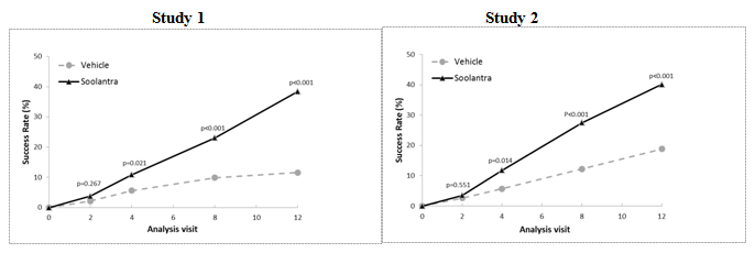 Soolantra was statistically superior to vehicle cream on the co-primary efficacy endpoints with a time to onset of efficacy of 4 weeks of treatment (p<0.05).