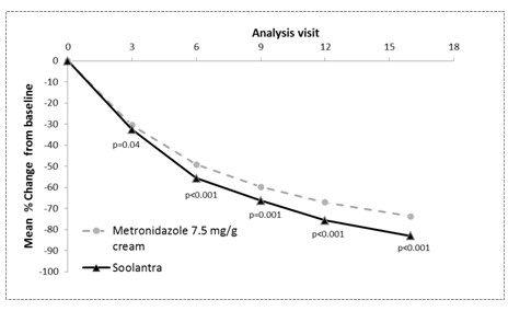 The results of the study demonstrated that Soolantra was statistically superior to Metronidazole 7.5 mg/g cream on the primary efficacy endpoint (Mean Percent Change in Inflammatory Lesion Counts) with a reduction of 83.0% and 73.7% from baseline after 16 weeks of treatment for the ivermectin and metronidazole groups respectively (p<0.001). The superiority of Soolantra at Week 16 was confirmed on Success Rate based on IGA and Absolute Change in Inflammatory Lesion Counts (secondary endpoints (p<0.001).