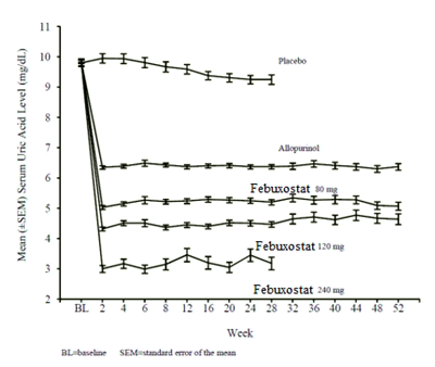 EXCEL Study (C02-021): The Excel study was a three years Phase 3, open label, multicenter, randomised, allopurinol-controlled, safety extension study for patients who had completed the pivotal Phase 3 studies (APEX or FACT). A total of 1,086 patients were enrolled: febuxostat 80 mg QD (n=649), febuxostat 120 mg QD (n=292) and allopurinol 300/100 mg QD (n=145). About 69 % of patients required no treatment change to achieve a final stable treatment. Patients who had 3 consecutive sUA levels > 6.0 mg/dL were withdrawn.