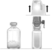 5. With BAXJECT II Hi-Flow attached to the solvent vial, invert the system so that the solvent vial is on top of the device. Insert the purple plastic spike through the FEIBA stopper. The vacuum will draw the solvent into the FEIBA vial (Fig d).