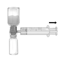 2. Invert the system so that the dissolved product is on top. Draw the FEIBA solution into the syringe by pulling the plunger back SLOWLY and ensure that the tight connection between BAXJECT II Hi-Flow and the syringe is maintained throughout the whole pulling process (Fig. f).