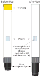 Note: the yellow cap prevents the device from activating, and should not be removed before injection is required. The black injector tip should be kept away from the hand.