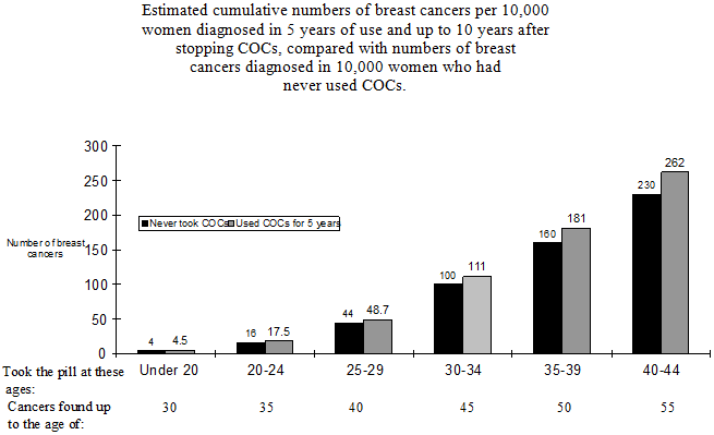 A meta-analysis from 54 epidemiological studies reported that there is a slightly increased relative risk (RR = 1.24) of having breast cancer diagnosed in women who are currently using combined oral contraceptives (COCs). The observed pattern of increased risk may be due to an earlier diagnosis of breast cancer in COC users, the biological effects of COCs or a combination of both. The additional breast cancers diagnosed in current users of COCs or in women who have used COCs in the last ten years are more likely to be localised to the breast than those in women who never used COCs.