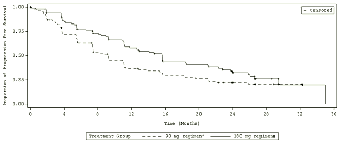 In patients with any brain metastases at baseline, intracranial disease control rate was 77.8% (95% CI 67.2-86.3) in the 90 mg arm (N = 81) and 85.1% (95% CI 75-92.3) in the 180 mg arm (N=74).