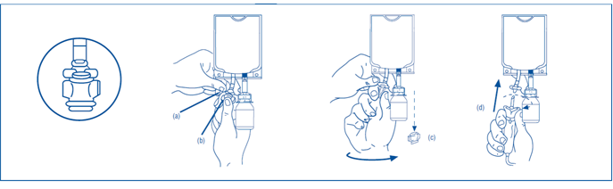 4. Prime set and regulate administration as required. If administration set becomes blocked do not pump contents back into container but replace equipment.