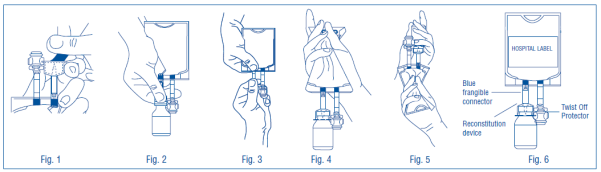 5. Just prior to administration, break blue frangible connector. Grip top of blue frangible connector between thumb and forefinger of one hand. Grip base of frangible with thumb and forefinger of other hand. Break frangible seal by bending 90° in one direction then 180° in the opposite direction. Fig. 3.